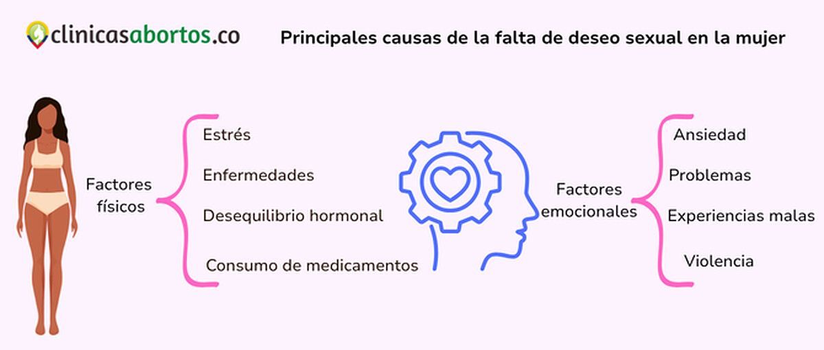 La falta de deseo sexual en la mujer es la ausencia de interés por la actividad sexual y puede ser primaria o secundaria, generalizada o situacional. Sus causas suelen ser físicas (como estrés, enfermedades o hormonas) y emocionales (como ansiedad, experiencias negativas o problemas de pareja).